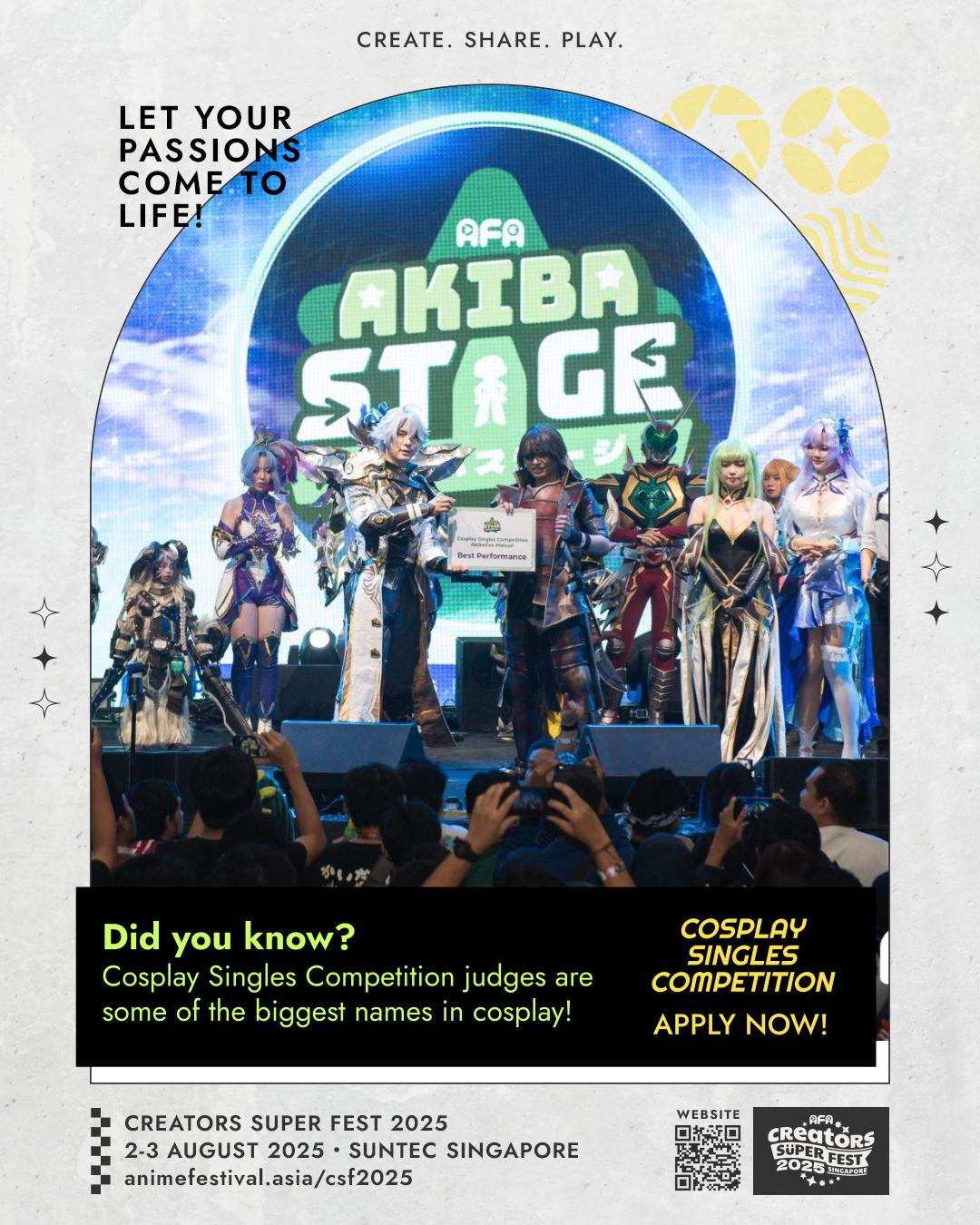 The Cosplay Singles Competition returns to AFA Creators Super Fest Singapore 2025, where cosplayers can flex their craftsmanship and performance skills.