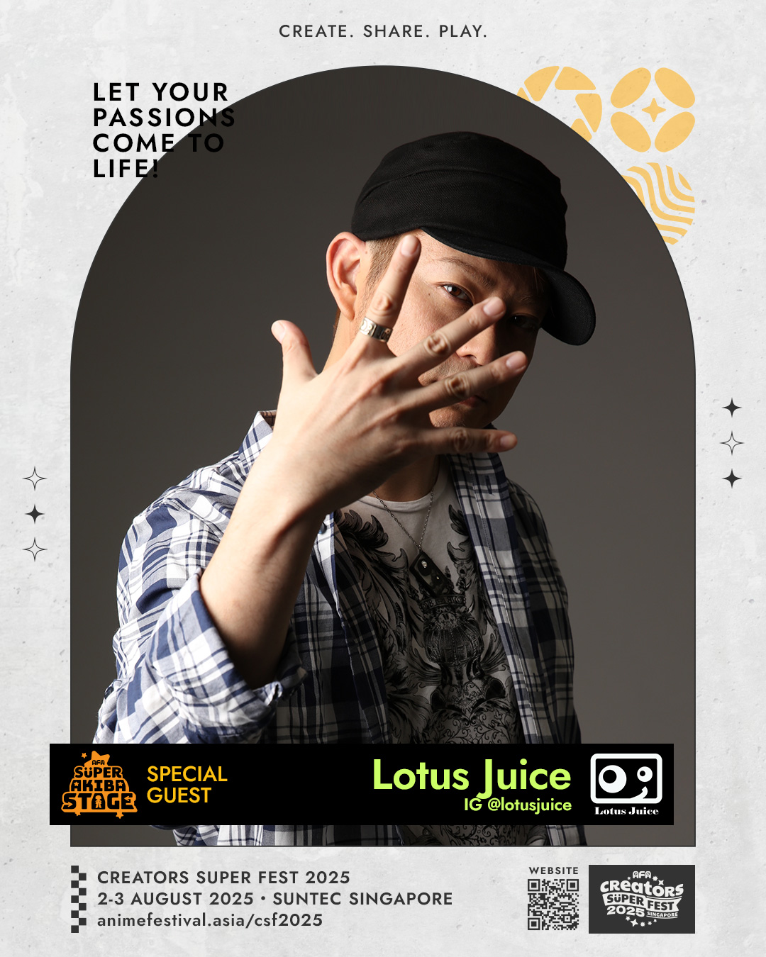 Firing up the Super Akiba Stage with his red-hot rapping, Lotus Juice is headed for AFA Creators Super Fest Singapore 2025 for his debut performance! One of the pioneers in rap for official Japanese anime and game music, Lotus Juice’s ingredients are from 90’s Hip Hop, J-Pop, Dub, Rock, Comedy, Love and many more.