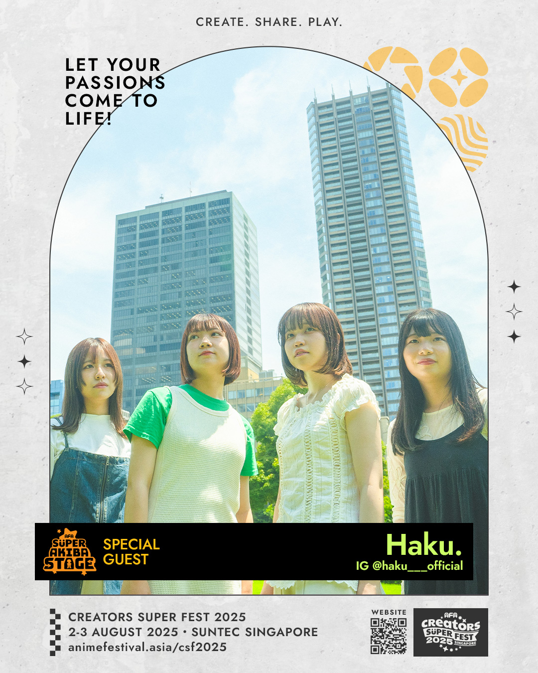 Overflowing with indie music spirit, Haku. will be performing live at AFA Creators Super Fest Singapore 2025!Haku., formed in 2019, is a four-piece band based in Osaka. The band expresses trembling emotions, with the crystal clear voice of vocalist Ai, influenced by the sound of British and American indie pop. After many sold out solo shows and multiple mini-album releases in Japan, this is Haku. ‘s first live performance in Singapore.