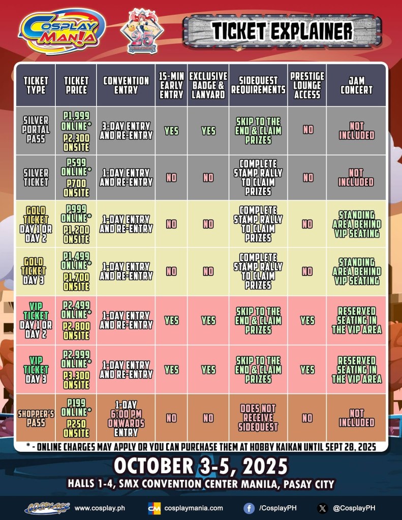 Don’t forget to purchase your tickets at cosplaymania.cosplay.ph! Mark the dates and watch as the season unfolds into a memorable day of fun & excitement with thousands of amazing fans celebrating anime and cosplay awesomeness only at Cosplay Mania 2025! Make sure to follow Cosplay Mania 2025 official website and social media channels for more exciting updates!